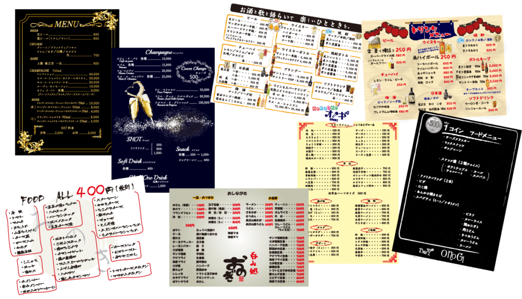 ・ドリンクメニュー・フードメニュー・ランチメニュー etc…お写真等の資料を頂きますとメニューに載せることもできます。